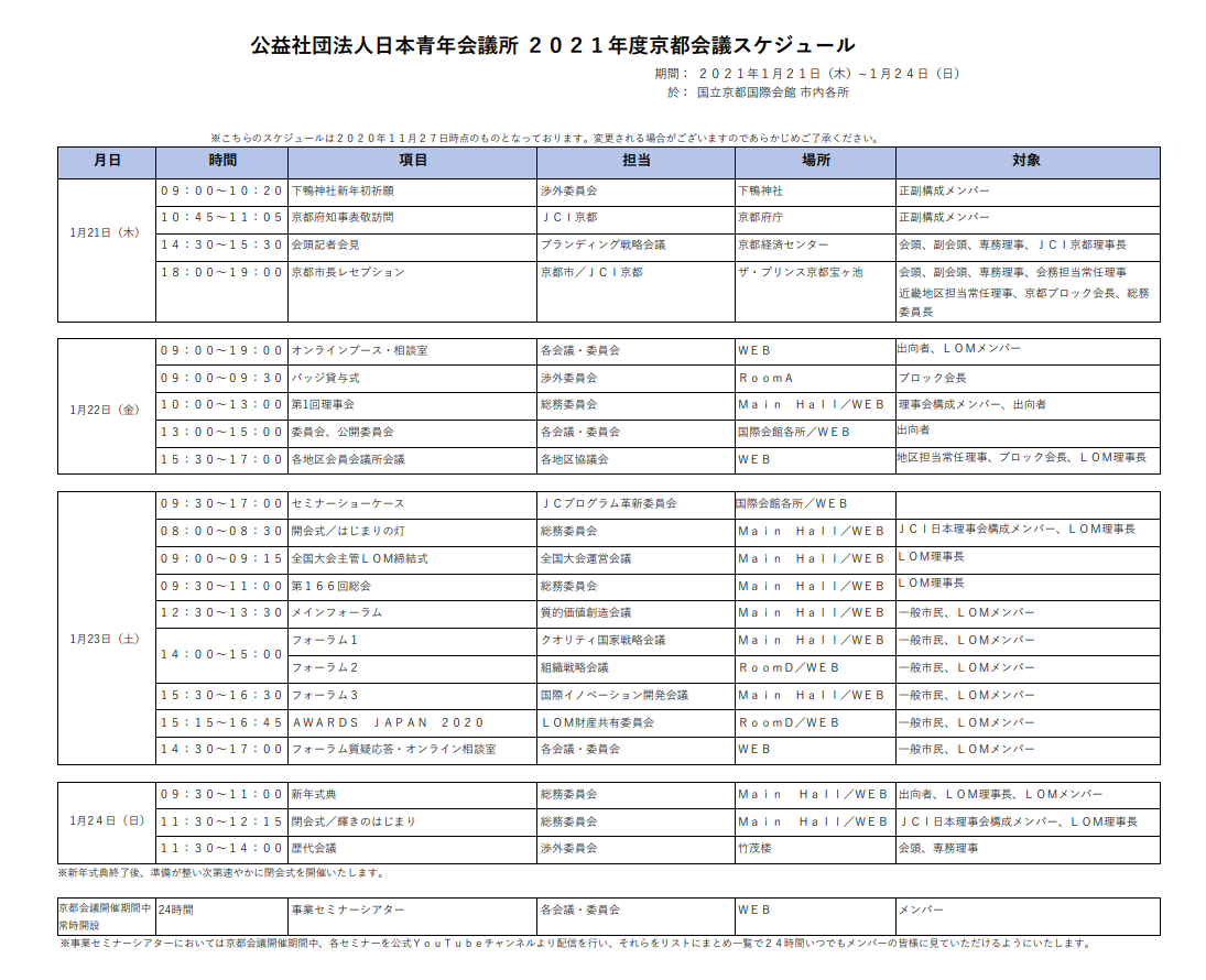 本日は、公益社団法人日本青年会議所 京都会議WEB開催のご案内をさせていただきます。先日より、一般会員向けではWEB配信ということで理事会などにて案内がありましたが、1月9日(土)に新型コロナウイルス感染拡大防止の観点から、京都府をはじめ関西3府県が、政府に対し緊急事態宣言の発令を要請したこと、また、京都府が、緊急事態宣言発出の地域との往来について自粛要請を出していることを鑑み、日本青年会議所として、【全国からの移動を伴う実地での京都会議は開催せず、初のWEB開催に挑戦する運びとなりました。】ということで案内がありました。