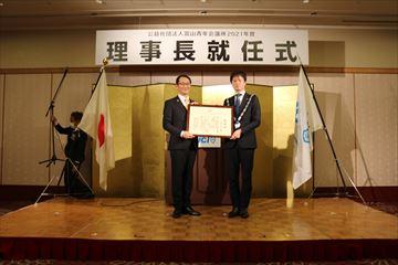 まず、2020年度渡辺理事長より開会のゴングが鳴らされた後、挨拶をいただきました。その後2021年度の松浦理事長が登壇され、2021年度の副理事長の手によってプレジデンシャルリースが渡辺理事長から松浦理事長へと引き継がれました。次に、そのプレジデンシャルリースを身にまとった松浦理事長より、本年度にかける強い想いと覚悟が述べられ、2020年を牽引された渡辺直前理事長へ感謝状の贈呈が行われました。