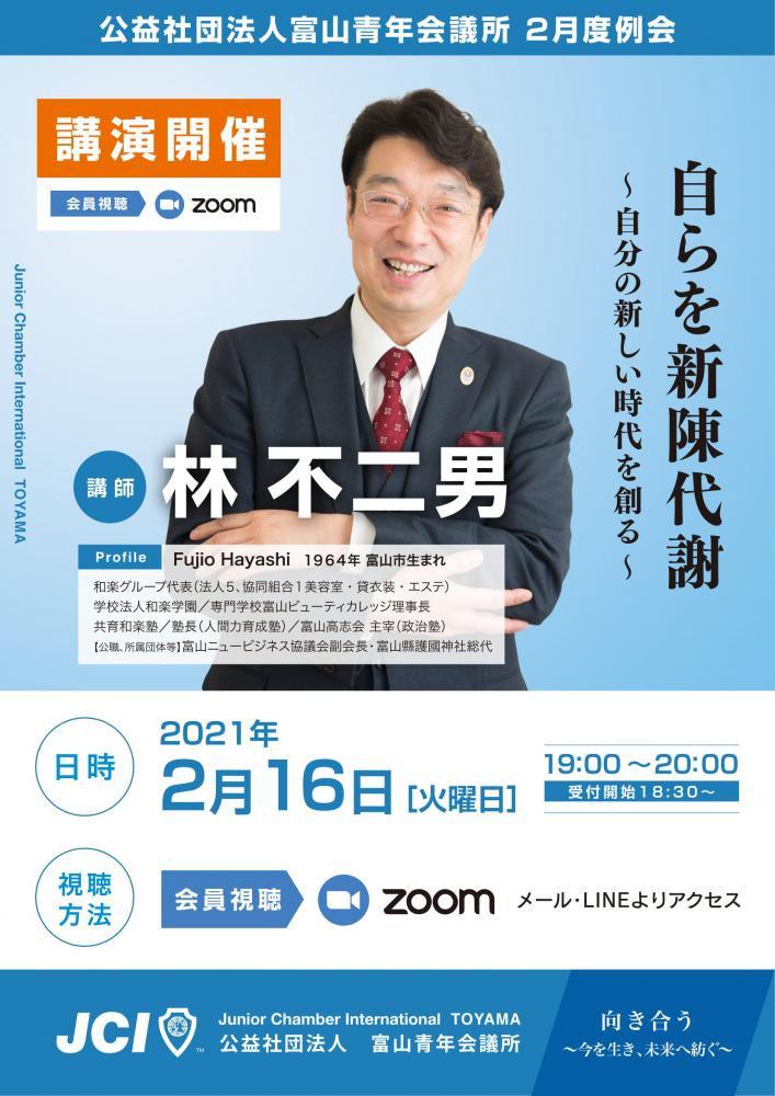 今回は講師に林不二男先輩をお迎えし、「自らを新陳代謝」~自分の新しい時代を創る~の講演テーマのもと講演していただきます。講演を通じて、本年度の富山青年会議所の運動・活動の方向性を知っていただくと共に、自分自身と向き合う重要性を認識いただく機会になればと考えております。
