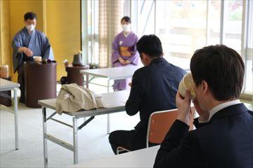 お茶を運んで頂いた女性に、私達が素人3人組だとバレて優しくお菓子の説明をしてくれました。私が変なお菓子と思ったお菓子は、野並会頭の勤務先である崎陽軒のシュウマイ弁当に入っているものをオマージュしたもの(後に在田歴代理事長から醤油入れと教えて頂きました)らしく、こういう心遣いは嬉しいだろうなと思い、京都青年会議所茶道同好会青松会のおもてなしの素晴らしさを感じることが出来ました。