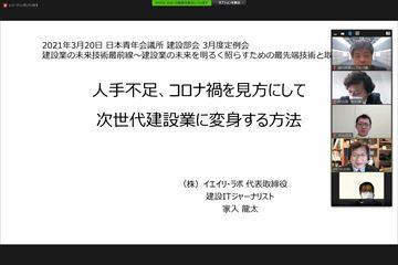 なんでこんな話をしているのかというと、今回はクラブの事業ではなく、本会の定例会に参加してきた、という報告の話なのです。ということで、参加してきた定例会のお話。本会3月度定例会は『建設業の未来を明るく照らす勉強会~最先端技術と取組事例~』、講師に建設ITジャーナリストである入家 龍太氏、ソフトバンクの関連企業であるSB C&S様にお招きしてのWEB講演会でした。事業タイトルのとおり、建設業における最先端技術を事例とともに紹介するというもので、これからの建設業に活かすことのできる情報が満載の定例会、自分の仕事に活かせるビジネスの話でありました。青年会議所活動中にはなかなかできない業界ビジネスについて学べる、というのが部会に所属している最大のメリットです。幸か不幸か、新型コロナウィルス感染症の影響で、部会ではWEBで参加することもできる定例会がスタンダードになってきています。富山にいながら建設業界について学ぶ機会がほしい、という方は是非一度門戸を叩いてみてはいかがでしょうか。