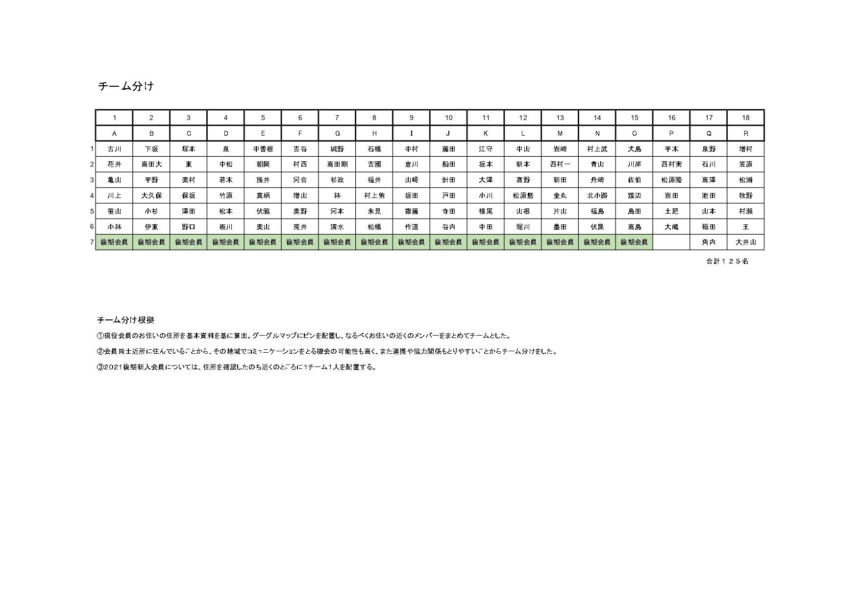 今回のチーム分けは、現役会員のお住いの住所を基本資料を基に算出しグーグルマップにピンを配置し、なるべくお住いの近くのメンバーをまとめてチームとしております。近所に住んでいることから、その地域でコミュニケーションをとる機会が高く、また連携や協力関係も取りやすいことを理由にチーム分けをしました。2021アカデミー後期新入会員については、住所を確認したのち近くのところに1チーム1人を配置しております。