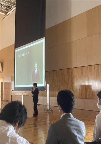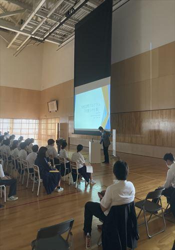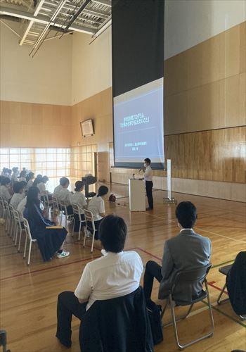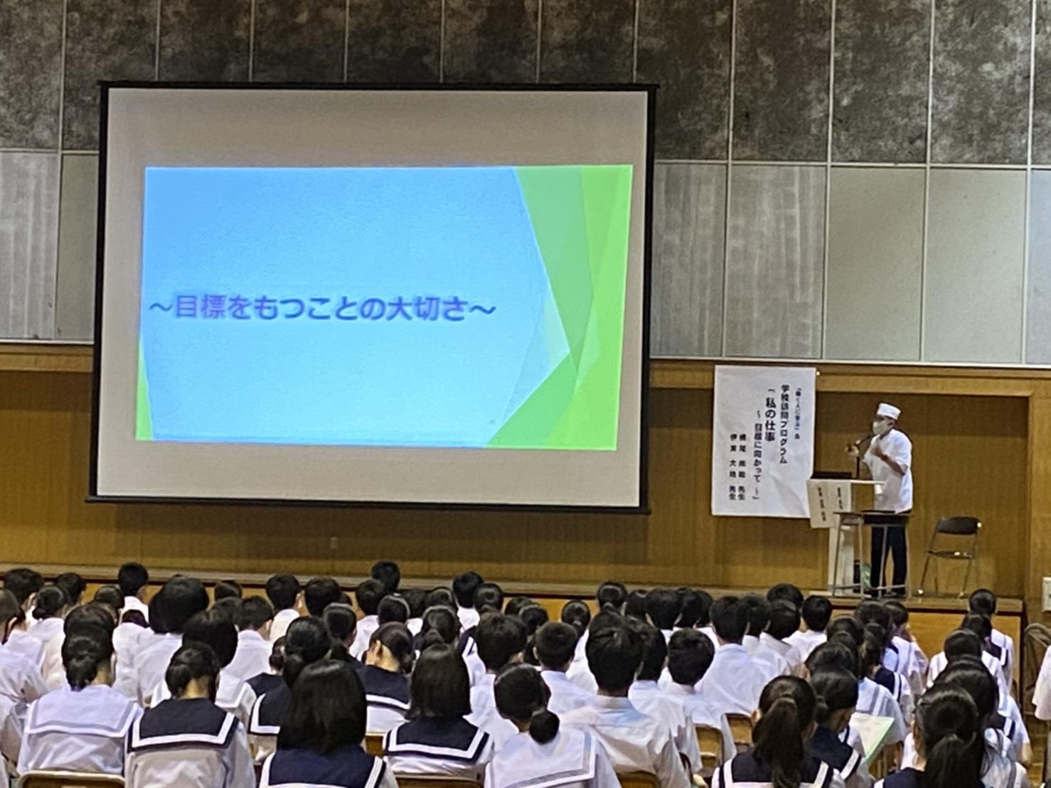 皆様、お疲れ様です。次世代育成委員会の横尾 尚和です。7月8日(木)に学校訪問プログラムとして堀川中学校で約20分間と短い時間でしたが、「私の仕事」というテーマで講師をさせていただきました。今回の学校訪問プログラムで最大の総人数約350名の生徒の前での授業となりました。