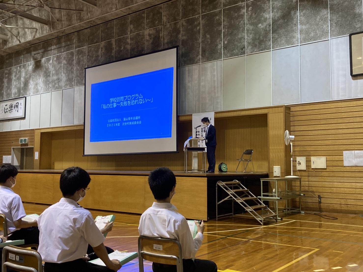 会員の皆様こんにちは。次世代育成委員会、総括幹事の泉野です。7月7日(水)は富山市立芝園中学校にて、7月8日(木)は富山市立堀川中学校にて学校訪問プログラムが開催されました。芝園中では4名の講師、堀川中では2名の講師が暑い体育館の中、大勢の生徒の前で熱気あふれる講演を行いました。細かい内容は講師の方から直接この後の文面でたっぷり語って頂きますので、そちらの方でご確認頂ければと思います。