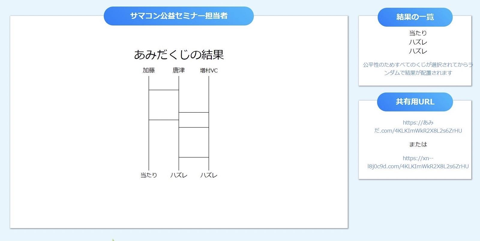 一体何考えてるんだ、この人達は・・・。そもそも、このふざけたサイト、どこから見付けてきたんだ。なんだよ「あみだ.com」って・・・。需要あんのか・・・?てか、もっと他にあっただろうよ・・・。絶対こんなので決めちゃいけないやつだぞ。これ。いいのか?別にオンラインの設営もするんだから、WEBでNさんにやってもらえばいいんじゃないか?