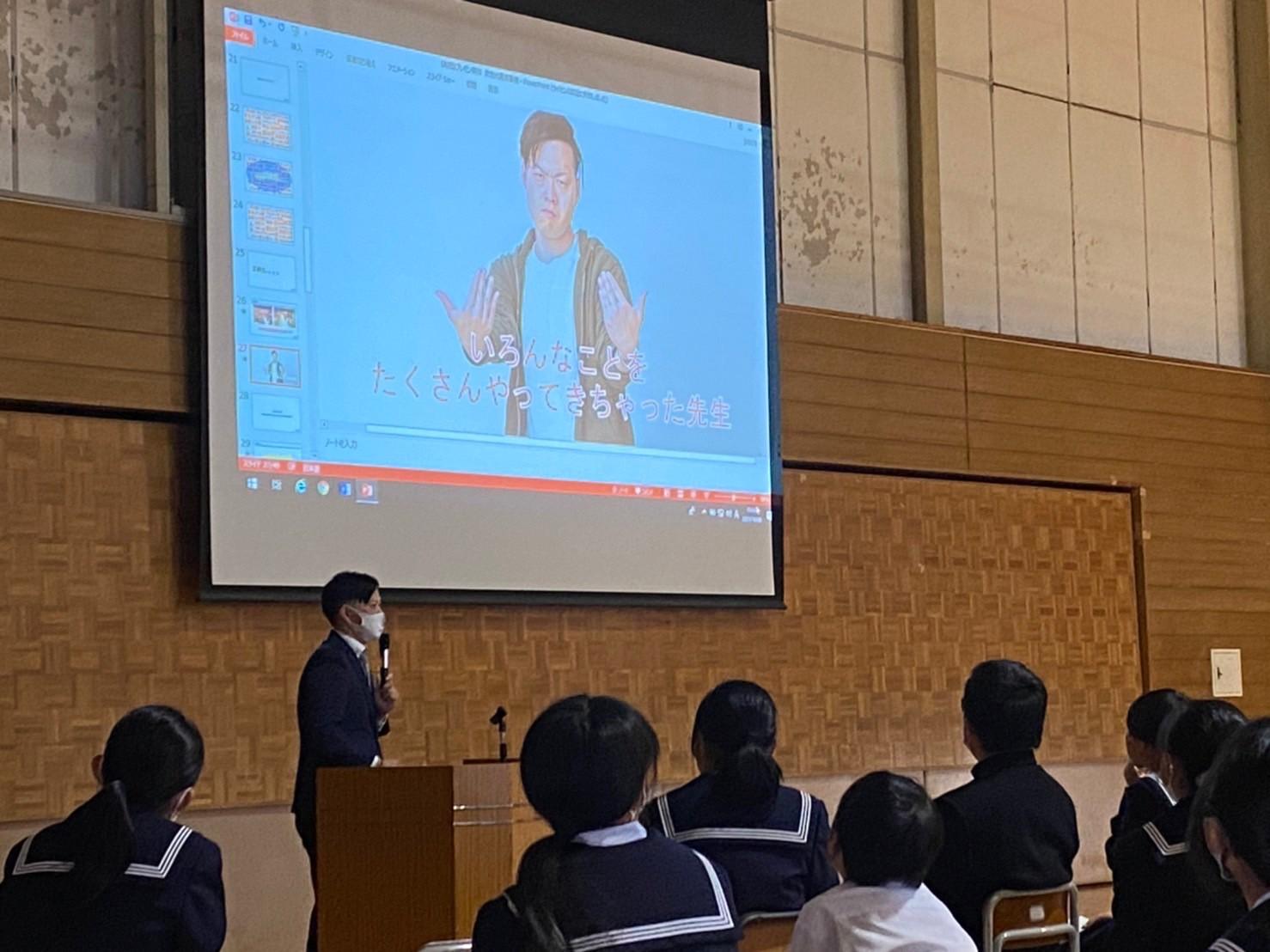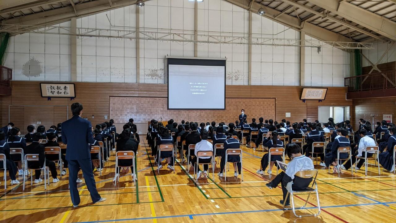 学校訪問プログラム、、、すごく良い事業だなと思い、自ら志望し発表をさせていただきました。普段から新入社員研修や大学生に講義などをしているので、余裕だと高を括っていましたが、練習のリハの時に予定時間の倍は話すわ、内容はわかりづらいはと散々な結果でした。