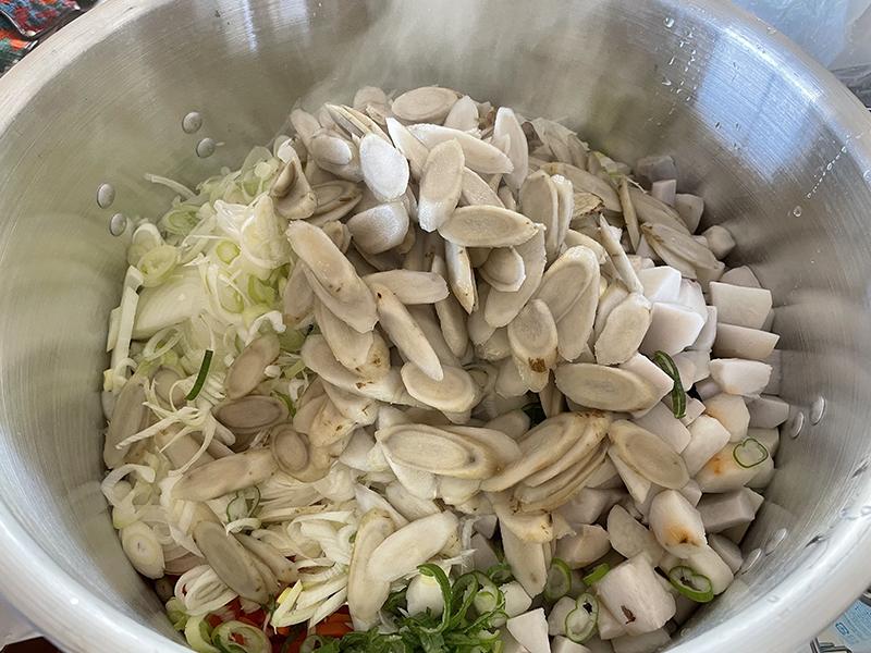 私は当日昼過ぎから、松浦理事長の作る豚汁の「豚汁アシスタント」の担いをいただきました。少し遅れて調理場に着くと、山積みになった大根をカットして下茹でをする松浦理事長の姿が・・・。湯気の奥から聞こえてきた一言目は