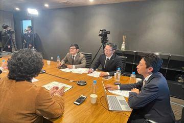 パネラーの皆さんをお迎えする泉委員。 泉委員は富山商工会議所青年部副会長を務めていらっしゃいます