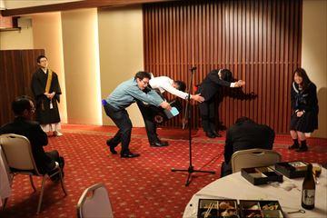 そんなこんなでリハーサル時間も終わり、今年度の理事の方たちが集まって来られました。19時になり、懇親会が始まるというところでミヤモンさんから無事に出産報告も頂き一安心です。私は、若木監事と松原委員長そして竹原副委員長と一緒のテーブルにご同席させて頂きました。皆様気さくに話しかけて下さり、色々な話も聞けて、この後に余興をすることを忘れてしまうくらい楽しい歓談の時間でした。